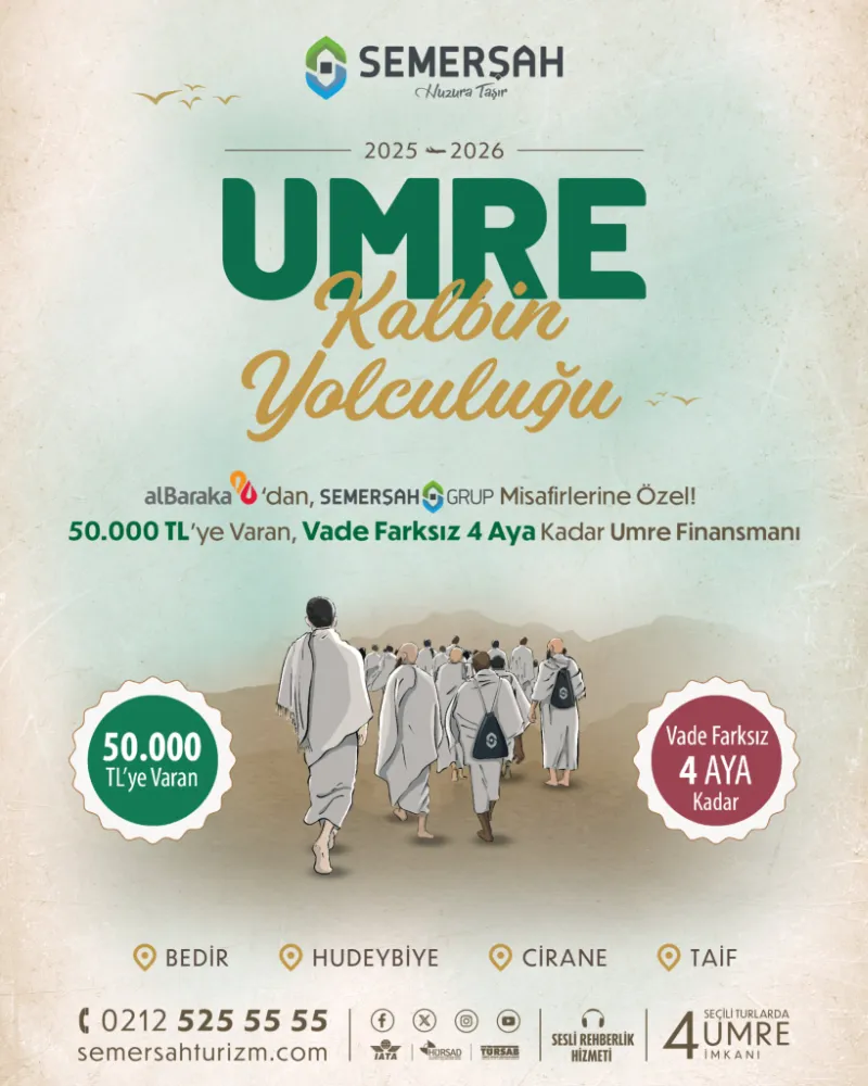 Semerşah Turizm, umre ibadetini yerine getirmek isteyen vatandaşlar için yeni bir fırsat sundu. 50.000 TL’ye varan vade farksız Albaraka finansman desteği ve özel kampanyalı fiyatlarla umre kayıtlarının devam ettiği duyuruldu.