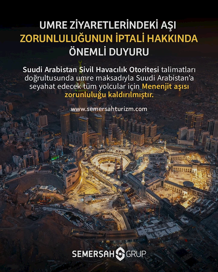 Semerşah Turizm umre ziyaretlerindeki aşı zorunluluğunun iptali hakkında önemli duyuruda bulundu. Semerşah Turizm açıklamalarında; Suudi Arabistan Sivil Havacılık Otoritesi talimatları doğrultusunda umre maksadıyla Suudi Arabistan’a seyahat edecek tüm yolcular için Menenjit aşısı zorunluluğu kaldırılmıştır. Sözlerine yer verdi.