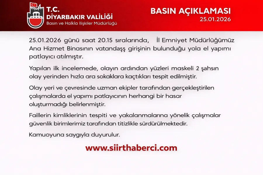 Diyarbakır Valiliği tarafından yapılan resmi basın açıklamasına göre, 25 Ocak 2026 günü saat 20.15 sıralarında İl Emniyet Müdürlüğü Ana Hizmet Binası’nın vatandaş girişinin bulunduğu yola el yapımı patlayıcı atıldı.