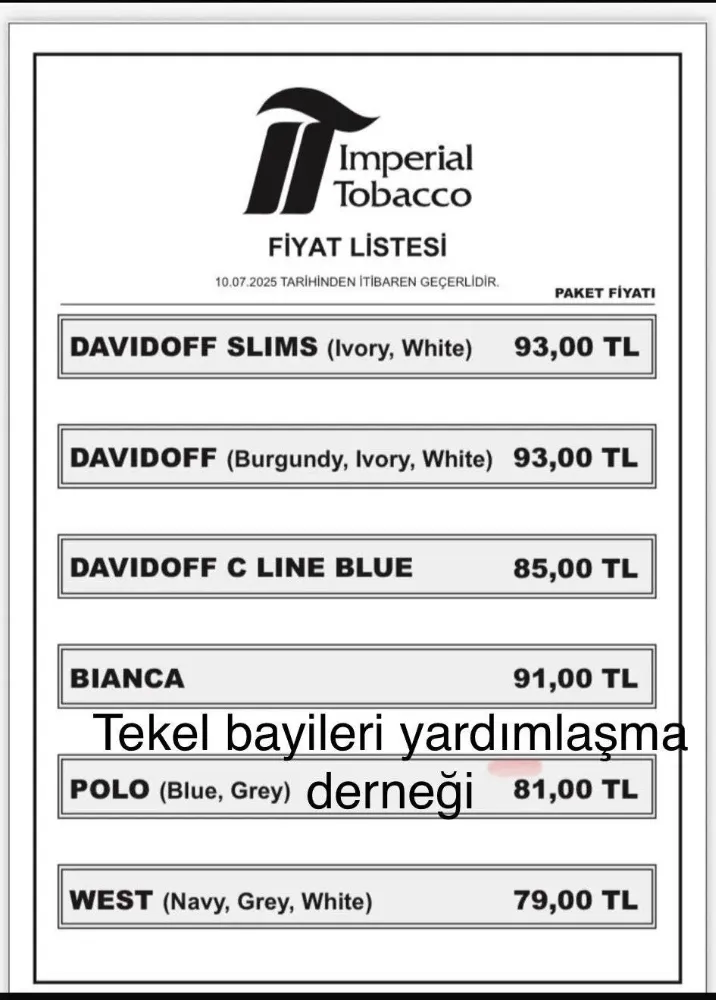 Şu an için Imperial Tobacco grubunun resmi yeni fiyat listesi açıklanmış değil. Ancak satış noktalarının raf düzenlemelerine başladığı ve fiyatların önümüzdeki günlerde netleşeceği öğrenildi.