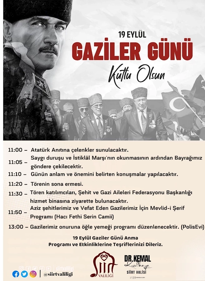 Siirt Valiliği, 19 Eylül Gaziler Günü dolayısıyla düzenlenecek anma programının detaylarını kamuoyuyla paylaştı.