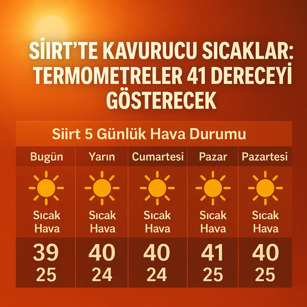 Meteoroloji Genel Müdürlüğü’nden alınan bilgilere göre Siirt, önümüzdeki beş gün boyunca kavurucu sıcakların etkisi altında olacak. Gün içinde sıcaklıklar 39 ile 41 derece arasında değişirken, özellikle hafta sonu rekor sıcaklıklar bekleniyor.