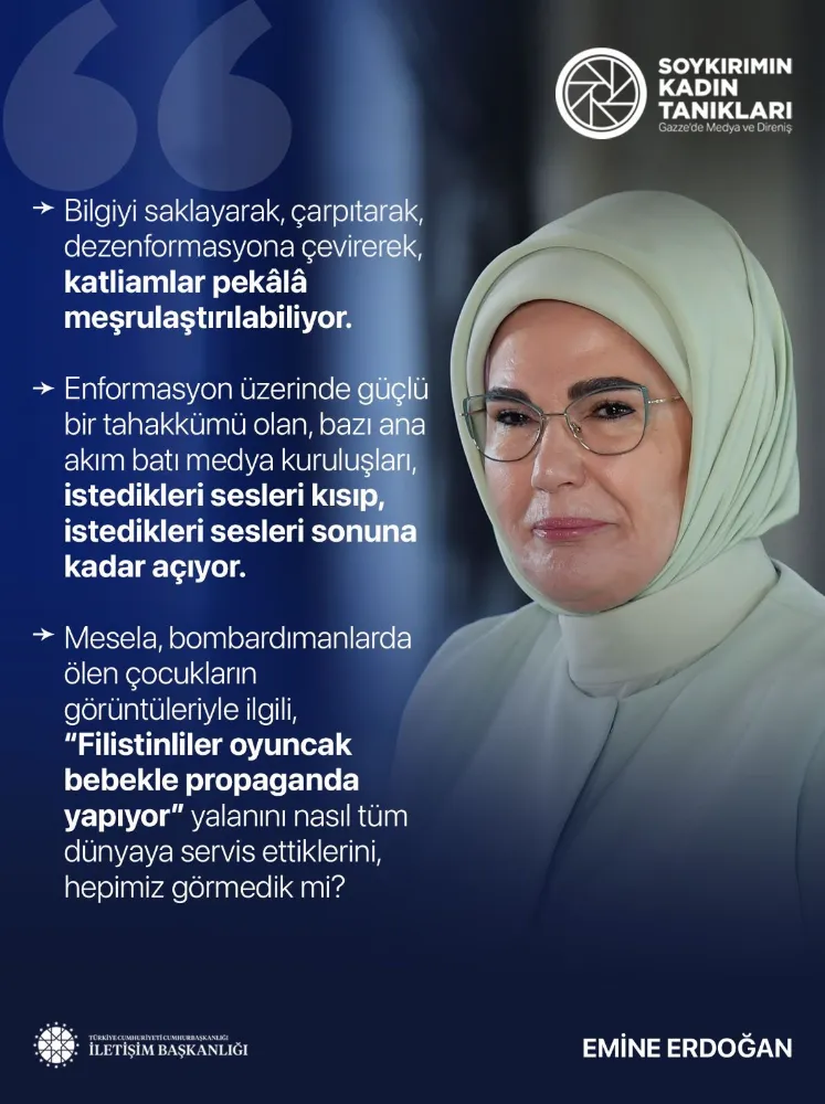 Panelde en güçlü vurgu, İsrail’in bilgi akışını manipüle ederek küresel medya düzeni üzerinde kurduğu tahakküme oldu. Emine Erdoğan’ın sert eleştirileri dikkat çekti: