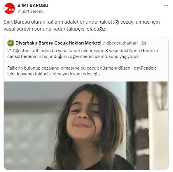 Siirt Barosu, 8 yaşındaki Narin Güran’ın kaybolmasının ardından cansız bedenine ulaşılmasıyla ilgili yaptığı açıklamada, faillerin adalet önünde hak ettikleri cezayı almaları için sürecin sonuna kadar takipçisi olacaklarını vurguladı.
