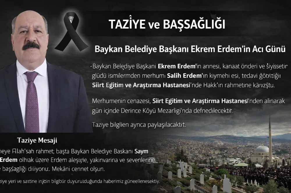 Merhumeye Allah’tan rahmet; başta Baykan Belediye Başkanı Sayın Ekrem Erdem olmak üzere Erdem ailesine, yakınlarına ve sevenlerine sabır ve başsağlığı diliyoruz.