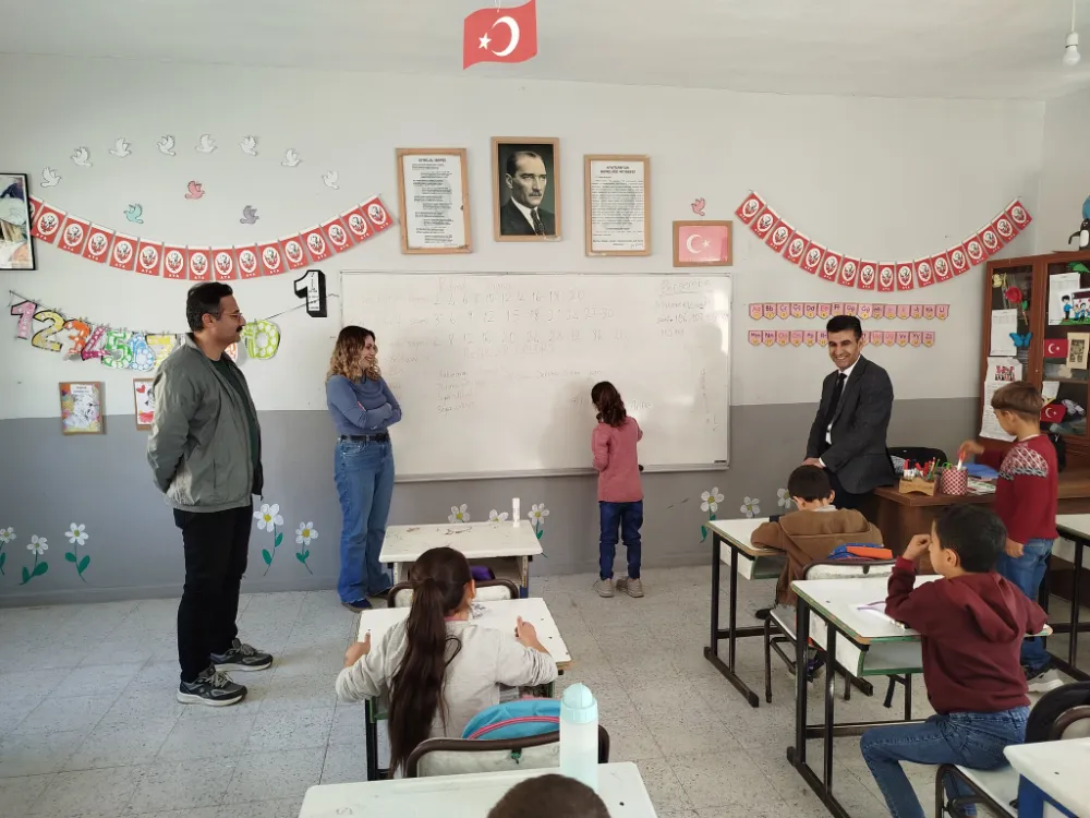 Ziyarette okul yönetimi ve öğretmenlerle bir araya gelen Müdür Gülmez, öğrencilerin ders durumları hakkında bilgi aldı ve sınıfları gezerek öğrencilerle yakından ilgilendi.