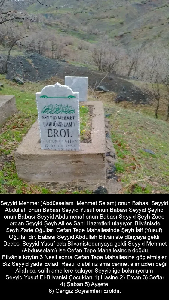 Bilvanis ve Cefan Tepe Mahallesi’nde yaşamış olan Seyyid Mehmet (Abdüsselam) Erol’un kabri bu silsilenin yakın dönem temsilcilerindendir. Onun babası Seyyid Abdullah, dedesi Seyyid Yusuf, silsileyi Seyyid Şeyh Ali es Sani’ye kadar götürmektedir. Bugün soy, Erol ailesi adıyla devam etmektedir.
