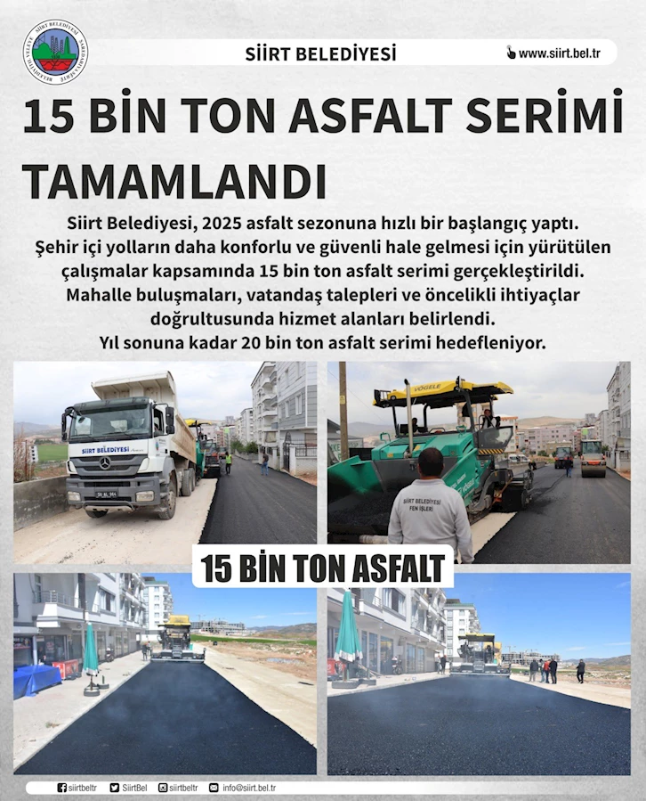 > “Siirt Belediyesi, 2025 yılı asfalt sezonu kapsamında şimdiye kadar 15 bin ton asfalt serimini tamamladı. Mahalle buluşmaları ve vatandaş talepleri doğrultusunda çalışmalarımız kararlılıkla devam ediyor.”