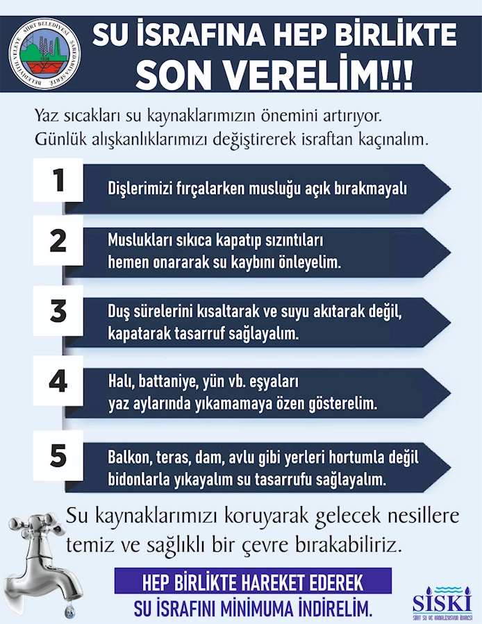 Siirt Belediyesi Sosyal medya hesaplarından vatandaşları su israfı konusunda önerilerde bulundu. Siirt Belediyesi x hesabından yaptığı paylaşımındaki açıklamalarında; Yaz aylarında su kaynaklarımızın ne kadar değerli olduğunu hepimiz biliyoruz. Bu nedenle, Siirt Belediyesi olarak su tasarrufu bilincini artırmak ve kaynaklarımızı korumak için sizlere pratik öneriler sunuyoruz. Unutmayın, küçük değişiklikler büyük farklar yaratabilir. Dişlerinizi fırçalarken musluğu kapalı tutun, Musluk sızıntılarını hemen gidererek su kaybını önleyin, Duş alırken suyu gereksiz yere akıtmayın, kısa sürelerle kullanın, Yaz aylarında halı ve battaniyeleri yıkamaktan kaçının, Dam, avlu, teras, balkon yıkarken hortum yerine bidon kullanarak su tasarrufu yapın. Paylaşımında bulundu.