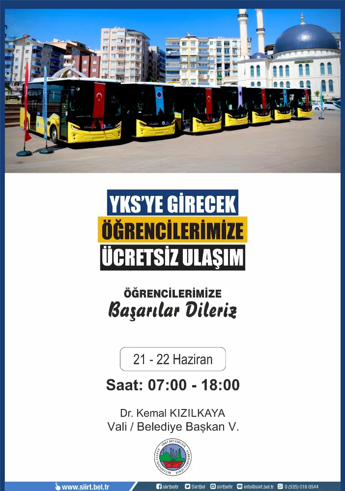 Siirt Belediyesi, 21-22 Haziran tarihlerinde yapılacak Yükseköğretim Kurumları Sınavı (YKS) için öğrencilere, velilere ve görevli öğretmenlere ücretsiz ulaşım hizmeti sunacak.