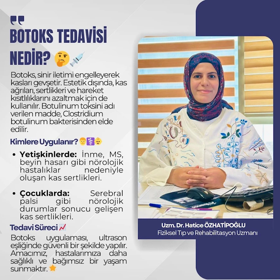 Dr. Özhatipoğlu, “Botoks, günümüzde estetik uygulamaların ötesinde, fizik tedavi ve rehabilitasyon alanında da yaygın olarak kullanılan bir tedavi yöntemidir. Asıl adıyla ‘botulinum toksini’ Clostridium botulinum bakterisinden elde edilen bir toksin olup sinir uçlarında iletimi sağlayan maddelerin salınımını engelleyerek kasların gevşemesini sağlar. Bu uygulama ile hastalarda ağrı, hareket kısıtlılığı ve kas sertliklerinin azaltılması amaçlanır.” dedi.