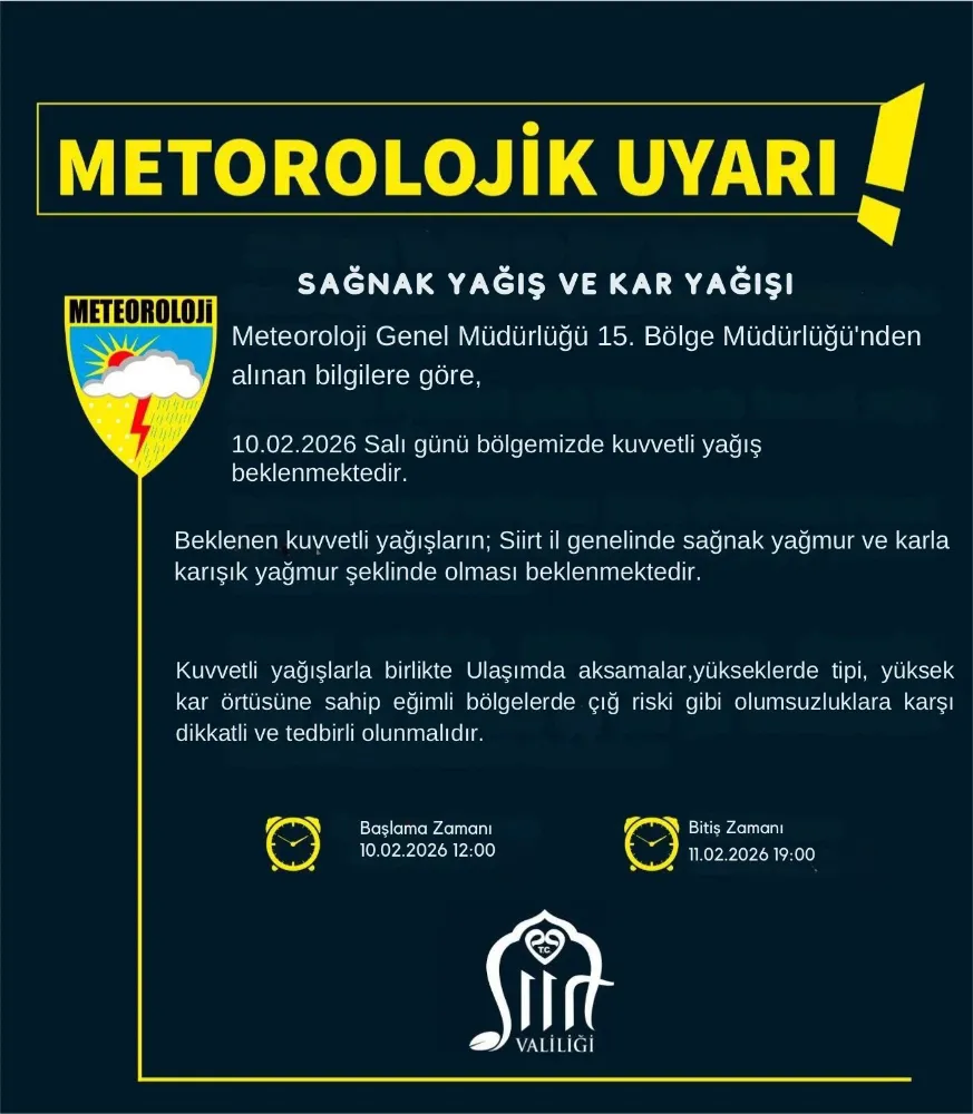 Meteoroloji Genel Müdürlüğü 15. Bölge Müdürlüğü, Siirt ve çevresi için kuvvetli yağış ve kar yağışı uyarısında bulundu. Yapılan son değerlendirmelere göre, 10 Şubat 2026 Salı günü öğle saatlerinden itibaren bölgede etkili olması beklenen yağışların, sağanak yağmur ve karla karışık yağmur şeklinde görüleceği bildirildi.