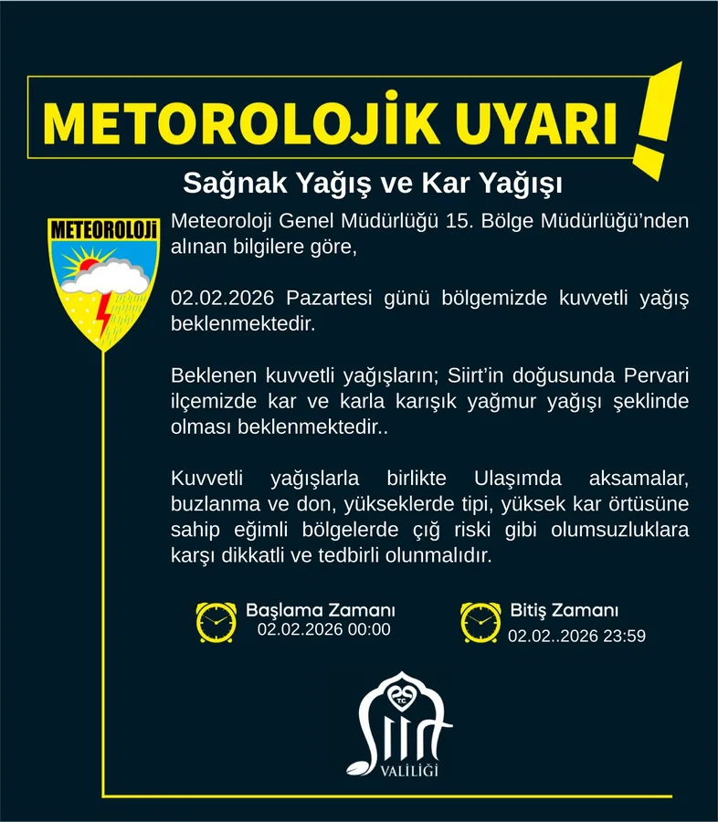 Meteoroloji Genel Müdürlüğü 15. Bölge Müdürlüğü, Siirt ve çevresi için önemli bir hava durumu uyarısında bulundu. Yapılan son değerlendirmelere göre, 02 Şubat 2026 Pazartesi günü bölgede kuvvetli yağış bekleniyor.