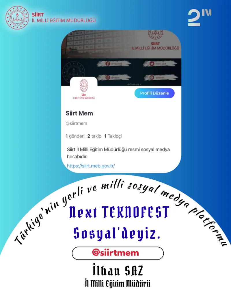 Siirt İl Millî Eğitim Müdürlüğü, dijitalleşme ve yerli-milli teknolojilerin kullanımını desteklemek amacıyla Türkiye'nin yerli sosyal medya platformu Next TEKNOFEST Sosyal’de yerini aldı.