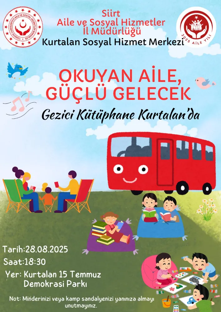 Aile ve Sosyal Hizmetler Bakanlığı koordinasyonunda, Siirt Aile ve Sosyal Hizmetler İl Müdürlüğü ve Kurtalan Sosyal Hizmet Merkezi Müdürlüğü tarafından 28 Ağustos 2025 Perşembe günü Kurtalan 15 Temmuz Demokrasi Parkı’nda kapsamlı bir etkinlik düzenlenecek.