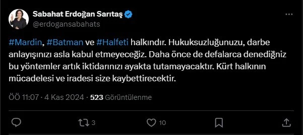Sarıtaş, bu atamaları "hukuksuzluk" ve "darbe anlayışı" olarak nitelendirerek, "Mardin, Batman ve Halfeti halkındır. Hukuksuzluğunuzu, darbe anlayışınızı asla kabul etmeyeceğiz," ifadelerini kullandı.