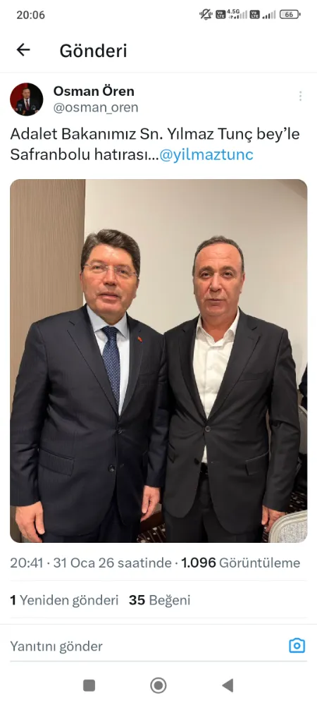 24. ve 27. Dönem AKParti Siirt Osman Ören, sosyal medya hesabından yaptığı paylaşımla, Yılmaz Tunç ile Safranbolu’da bir araya geldiklerini duyurdu. “Adalet Bakanımız Sn. Yılmaz Tunç bey’le Safranbolu hatırası” notuyla paylaşılan kare, kısa sürede ilgi gördü.