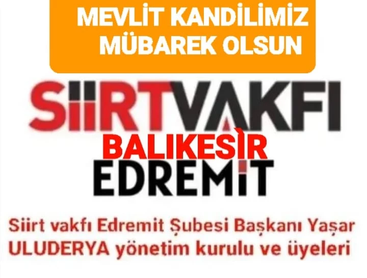 Mevlid Kandili dolayısıyla bir kutlama mesajı yayımlayan Siirt Vakfı Balıkesir Edremit Şube Başkanı Yaşar Uluderya, yönetim kurulu ve üyelerle birlikte tüm İslam âleminin kandilini tebrik etti. Uluderya mesajında, bu mübarek gecenin birlik, kardeşlik ve barışa vesile olmasını diledi.