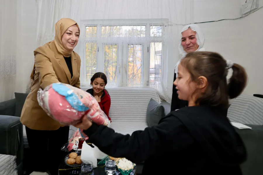 Vali Bey’in eşi Hanımefendi Nurten Kızılkaya ile Kaymakam Bey’in eşi Hanımefendi Özge Birge Özcan, aileyle yakından ilgilenerek özellikle çocuklara hediyeler takdim etti.