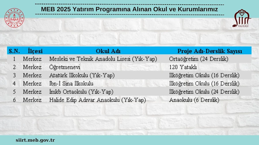 Vali Kemal Kızılkaya sosyal medya hesabından yaptığı paylaşımda, "2025 yılı yatırım programına giren toplam 86 sınıfı bulunan 5 okulumuz ve 1 yeni öğretmenevimiz ile birlikte 6 yeni eğitim yatırımını Siirt’imize kazandırıyoruz. Bu kıymetli projelerin hayata geçirilmesini sağlayan başta Cumhurbaşkanımız Recep Tayyip Erdoğan’a, Milli Eğitim Bakanımız Sayın Prof. Dr. Yusuf Tekin’e şükranlarımı sunuyorum. Eğitim alanında da belirlediğimiz hedeflerimize emin adımlarla yürüyen, İl Milli Eğitim Müdürümüz ve ekibini de tebrik ediyorum" ifadelerine yer verildi.