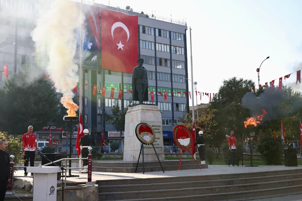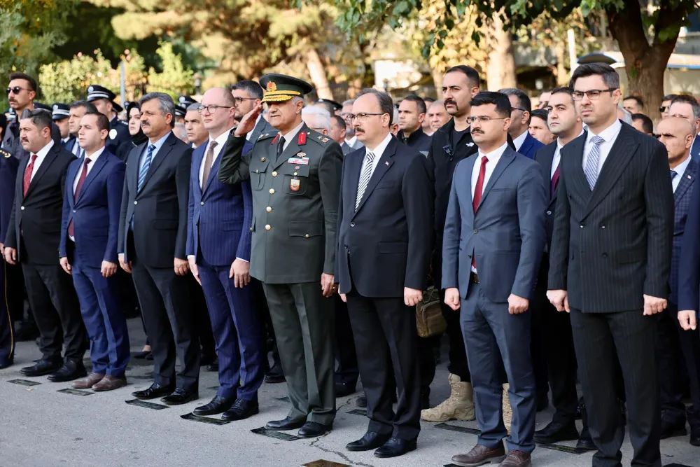 Cumhuriyet Meydanı'nda düzenlenen törende Vali Dr. Kemal Kızılkaya ve Garnizon Komutan vekili Tuğgeneral Mustafa Er tarafından Atatürk Anıtı'na çelenk sunuldu.