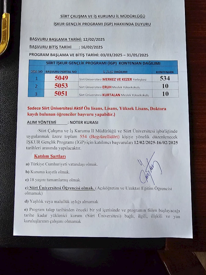 AK Parti Siirt Milletvekili Mervan Gül, Siirt’e İŞKUR Gençlik Programı başladığını duyurdu. AK Parti Siirt Milletvekili Mervan Gül, Üniversite okurken çalışmak isteyen öğrencilerimiz için harika bir fırsat. Siirt Üniversitesi MERKEZ ve KEZER Yerleşkesi Kontenjan 534 adet, Siirt Üniversite ERUH Meslek Yüksekokulu 10 Kontenjan 10 adet, Siirt Üniversitesi KURTALAN Meslek Yüksekokulu Kontenjan 10 adet, Ayda 5 gün katılacak öğrencilerimize 5.415 TL, Ayda 14 gün katılacak öğrencilerimize ise 15.162 TL destek verilecek. Hem mesleki deneyim kazanıp hem de gelir elde edebileceğiniz harika bir fırsat sizi bekliyor. Dedi.