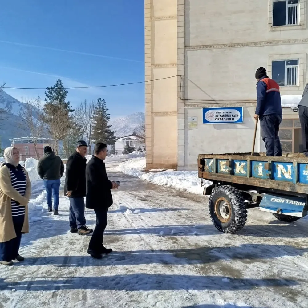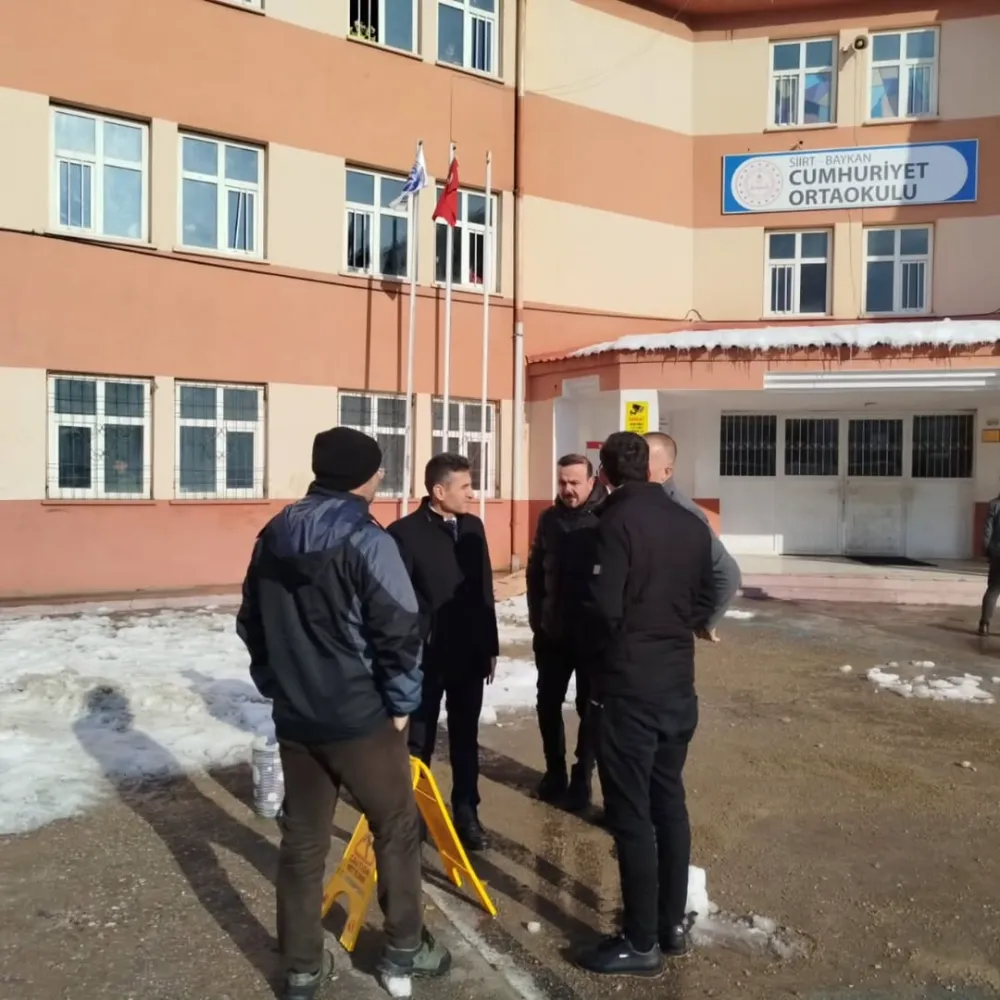 Baykan İlçe Milli Eğitim Müdürü Vahap Gülmez, Şube Müdürleri Osman Seven, Mücahit Kurhan ve Botan Sezgin eşliğinde, Baykan Belediyesi ekiplerince okul bahçeleri ile bina saçaklarında gerçekleştirilen kar ve buz temizleme çalışmalarını yerinde inceledi.