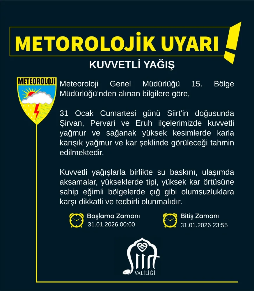 Yapılan değerlendirmelere göre Şirvan, Pervari ve Eruh ilçelerinde kuvvetli yağmur ve sağanak yağışın etkili olacağı, yüksek kesimlerde ise karla karışık yağmur ve kar yağışı görüleceği tahmin ediliyor.
