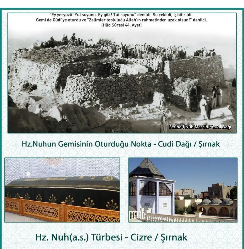 Cudi Dağı’nın zirvesinde ve eteklerinde yer alan, halk arasında “Sefine-i Nuh Mescidi” olarak adlandırılan alan; geminin oturduğu yer olduğuna inanılan nokta olarak kabul edilir. Rivayetlerde geminin burada aylarca kaldığı, tufanın tamamen çekilmesinin ardından insanlığın yeniden yeryüzüne buradan yayıldığı anlatılır.