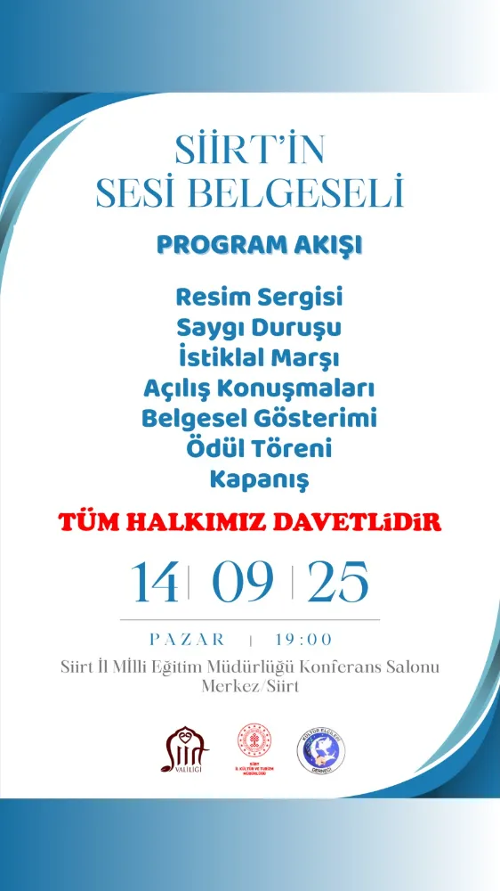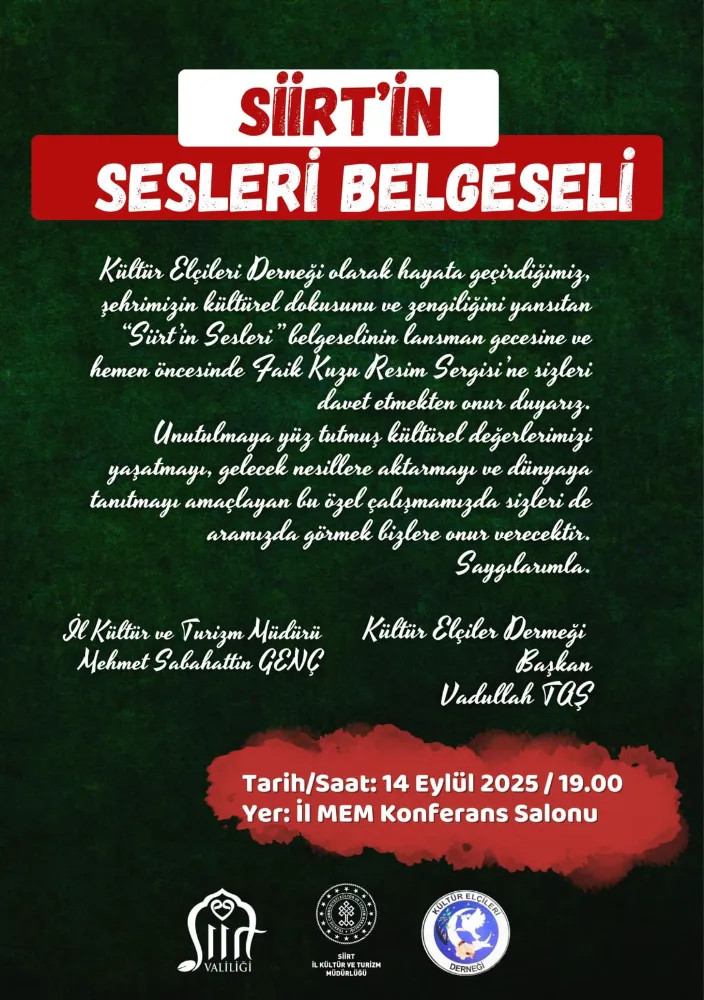 “Bugün kültür elçilerinin bu kıymetli faaliyetine hep birlikte şahitlik ediyoruz. Siirt’in kültürel mirasına ışık tutan bu çalışma, sadece bir belgesel değil; bir aşkın, bir emeğin ürünü. Bu tür faaliyetler, ilimizin tanıtımı ve değerlerinin korunması açısından son derece önemlidir. Emeği geçen herkese teşekkür ediyorum.”