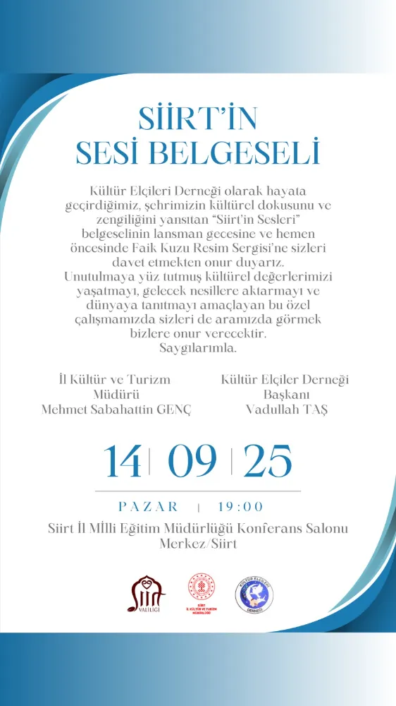 “Amacımız, unutulmaya yüz tutmuş kültürel değerlerimizi yaşatmak, yeni nesillere aktarmak ve aynı zamanda tüm dünyaya tanıtmaktır. ‘Siirt’in Sesleri Belgeseli’ de bu çabanın en somut örneklerinden biri oldu. Bu çalışmanın kalıcı bir miras bırakacağına inanıyoruz.”
