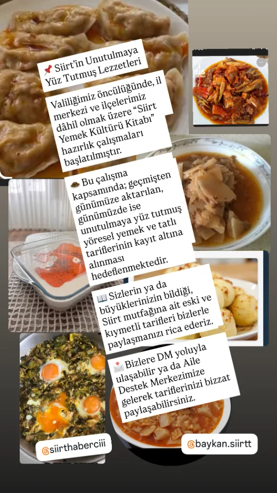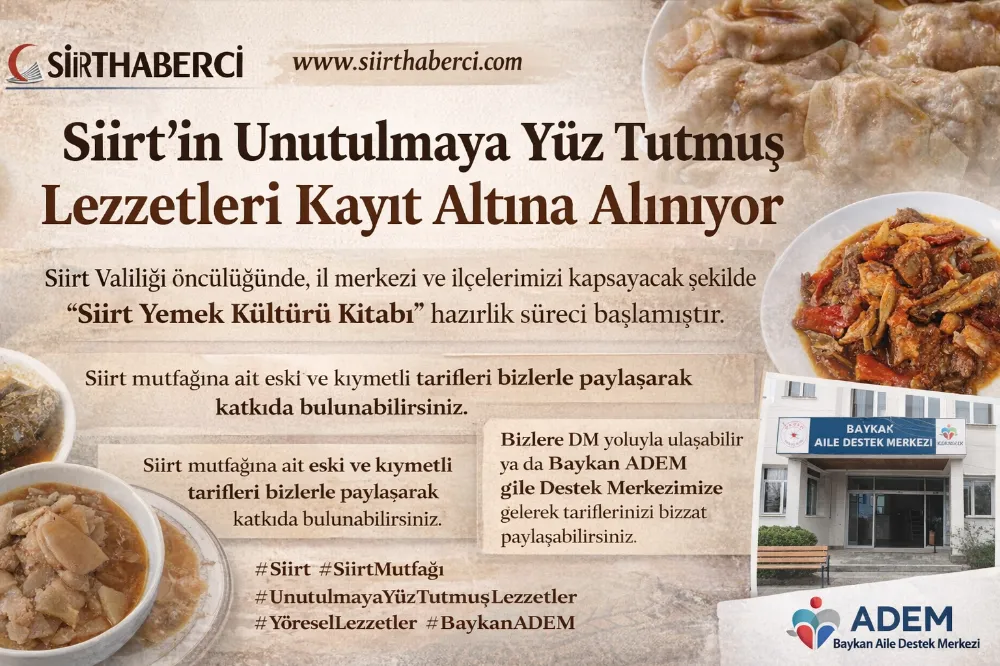 Bu kapsamda, Siirt mutfağına ait eski ve kıymetli tarifleri bilen vatandaşlardan destek bekleniyor. Tarifler, DM yoluyla iletilebileceği gibi, Baykan Aile Destek Merkezi (ADEM) başta olmak üzere ilgili merkezlere bizzat başvurularak da paylaşılabiliyor.