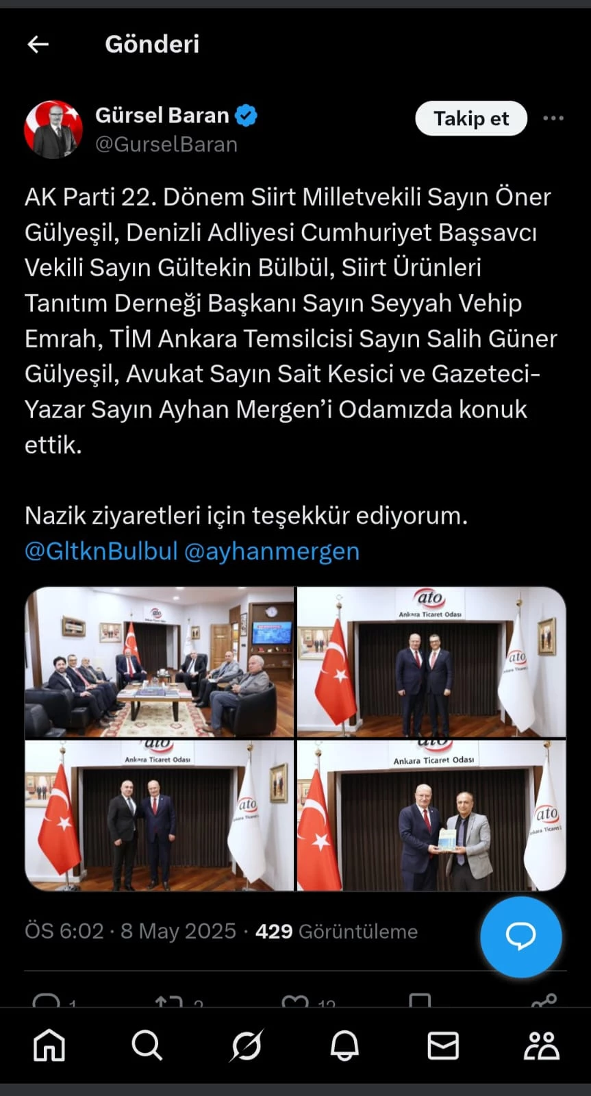 Aslen Siirtli olan Ankara Ticaret Odası (ATO) Başkanı Gürsel Baran, farklı tarihlerde ve ayrı heyetler halinde gelen hemşehrilerini makamında ağırladı. Her bir görüşmede, Siirt’in kalkınması ve tanıtımı adına önemli değerlendirmeler yapıldı.
