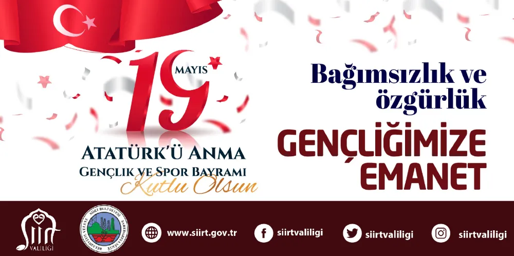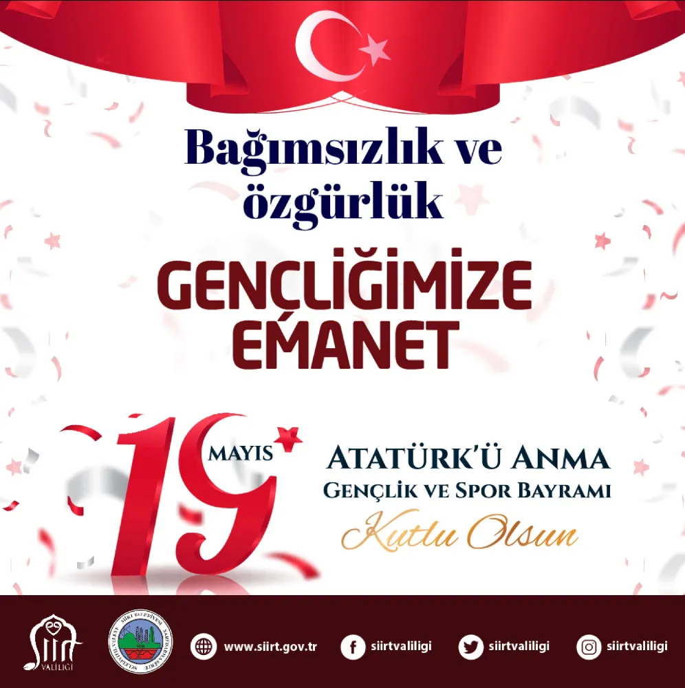 SİİRT VALİLİĞİ (İl Basın ve Halkla İlişkiler Müdürlüğü) Geleceğimizin teminatı olan gençlerimizin ve aziz milletimizin 19 Mayıs Atatürk’ü Anma, Gençlik ve Spor Bayramı kutlu olsun.