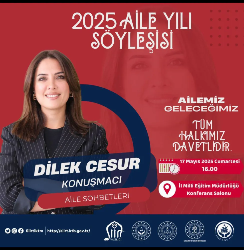 Siirt’te “2025 Aile Yılı” Kapsamında Anlamlı Buluşma: Dilek Cesur’dan Aile Sohbetleri Siirt, 2025 yılını "Aile Yılı" ilan eden etkinliklerle dolu dolu yaşamaya devam ediyor. Bu kapsamda düzenlenen söyleşiler serisinin bir parçası olarak, 17 Mayıs 2025 Cumartesi günü saat 16.00’da İl Milli Eğitim Müdürlüğü Konferans Salonu anlamlı bir etkinliğe ev sahipliği yapacak. Ailemiz Geleceğimiz temasıyla düzenlenecek olan bu özel söyleşinin konuşmacısı, aile üzerine çalışmaları ve toplumsal konulara duyarlılığı ile tanınan Dilek Cesur olacak. “Aile Sohbetleri” başlığıyla gerçekleşecek programda, ailenin toplumsal yapı içindeki yeri, günümüz aile dinamikleri ve kuşaklar arası iletişim gibi konular ele alınacak. Siirt Valiliği öncülüğünde Kültür ve Turizm Bakanlığı ile birçok kamu kurumunun iş birliğinde düzenlenen etkinlik, toplumun tüm kesimlerine açık olacak. Organizatörler, aile değerlerinin güçlendirilmesine yönelik bu tür etkinliklerin, bireyler ve toplum adına büyük önem taşıdığını vurguluyor. Tüm halkımız davetlidir! Etkinlik hakkında daha fazla bilgiye Siirt Kültür ve Turizm Müdürlüğü’nün resmi internet sitesi http://siirt.ktb.gov.tr adresinden ve @Siirtktm sosyal medya hesaplarından ulaşılabilir.