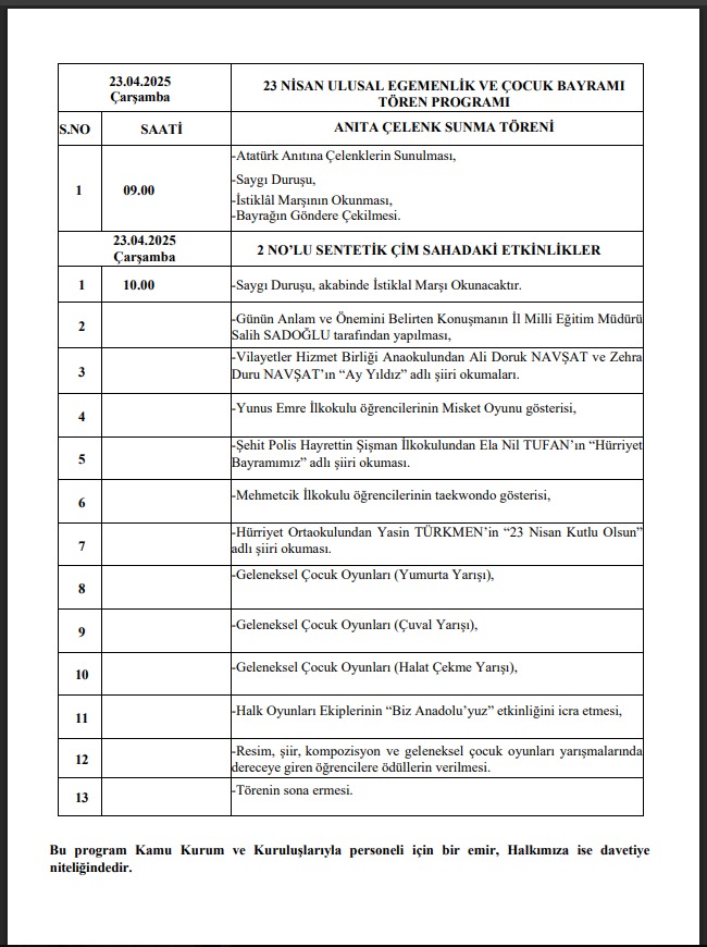 23 Nisan Ulusal Egemenlik ve Çocuk Bayramı’nın 105. yıldönümü, ilimizde düzenlenecek çeşitli etkinliklerle kutlanacak. Kutlamalar, 23 Nisan 2025 Çarşamba günü saat 08.00’de Atatürk Anıtı’na çelenk sunumuyla başlayacak. Saygı duruşu ve İstiklâl Marşı’nın okunmasının ardından şanlı bayrağımız göndere çekilecek. Törenler, daha sonra 2 Nolu Sentetik Çim Sahada devam edecek. Halkımızın ve öğrencilerin katılımıyla gerçekleşecek kutlama programı, günün anlam ve önemine dair konuşmalarla sürecek; öğrenciler şiirler okuyacak. Program kapsamında, öğrencilerin hazırladığı okul gösterileri ve geleneksel çocuk oyunları yarışmaları yer alacak. Halk Oyunları gösterileri, Taekwondo performansları, çuval yarışı, halat çekme ve yumurta taşıma yarışmaları ile renklenen etkinlikler, halk oyunları ekiplerinin “Biz Anadolu’yuz” temalı gösterisiyle devam edecek. İlk ve ortaöğretim kurumları arasında düzenlenen resim, şiir ve kompozisyon ve geleneksel çocuk oyunları yarışmalarında dereceye giren öğrencilere ödülleri takdim edilecek. Program, okulların geçit töreniyle sona erecek. 23 Nisan Ulusal Egemenlik ve Çocuk Bayramı Kutlu Olsun. SİİRT VALİLİĞİ