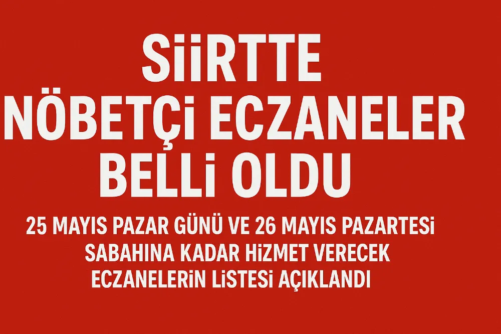 Siirt merkez ve ilçelerinde 25 Mayıs 2025 Pazar günü boyunca ve 26 Mayıs Pazartesi sabahına kadar nöbetçi olarak hizmet verecek eczaneler belli oldu. Vatandaşların ilaç ve sağlık ihtiyaçlarına kesintisiz hizmet sunmak amacıyla görevli olan eczanelerin listesi şu şekilde: