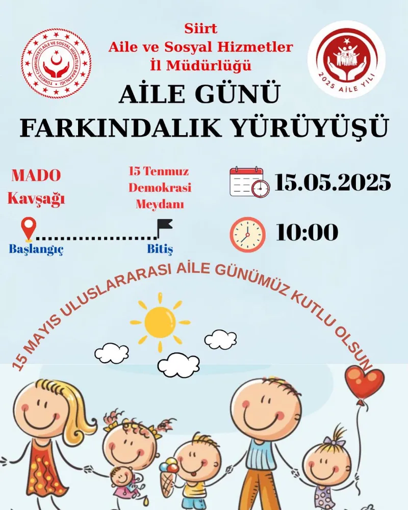 Siirt Aile ve Sosyal Hizmetler İl Müdürlüğü, 15 Mayıs Uluslararası Aile Günü kapsamında farkındalık oluşturmak amacıyla "Aile Günü Farkındalık Yürüyüşü" düzenliyor. Etkinlik, aile kurumunun önemine dikkat çekmek ve toplumsal birlikteliği güçlendirmek amacıyla gerçekleştirilecek.