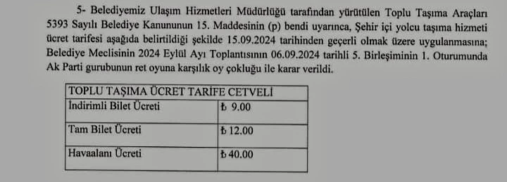 Belediye Meclisi'nin 06.09.2024 tarihli oturumunda AK Parti Grubu'nun ret oylarına rağmen oy çokluğuyla kabul edilen bu zam ile yeni ücretler şöyle belirlendi: İndirimli bilet ücreti 9 TL, tam bilet ücreti 12 TL, havaalanı taşıma ücreti ise 40 TL.