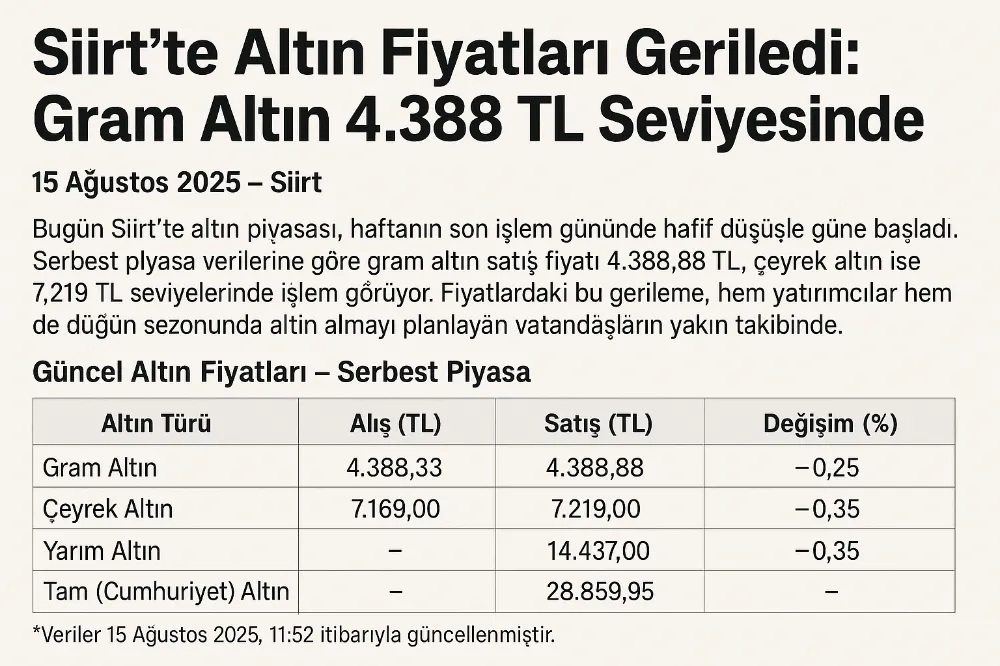 Bugün Siirt’te altın piyasası, haftanın son işlem gününde hafif düşüşle güne başladı. Serbest piyasa verilerine göre gram altın satış fiyatı 4.388,88 TL, çeyrek altın ise 7.219 TL seviyelerinde işlem görüyor. Fiyatlardaki bu gerileme, hem yatırımcılar hem de düğün sezonunda altın almayı planlayan vatandaşların yakın takibinde.