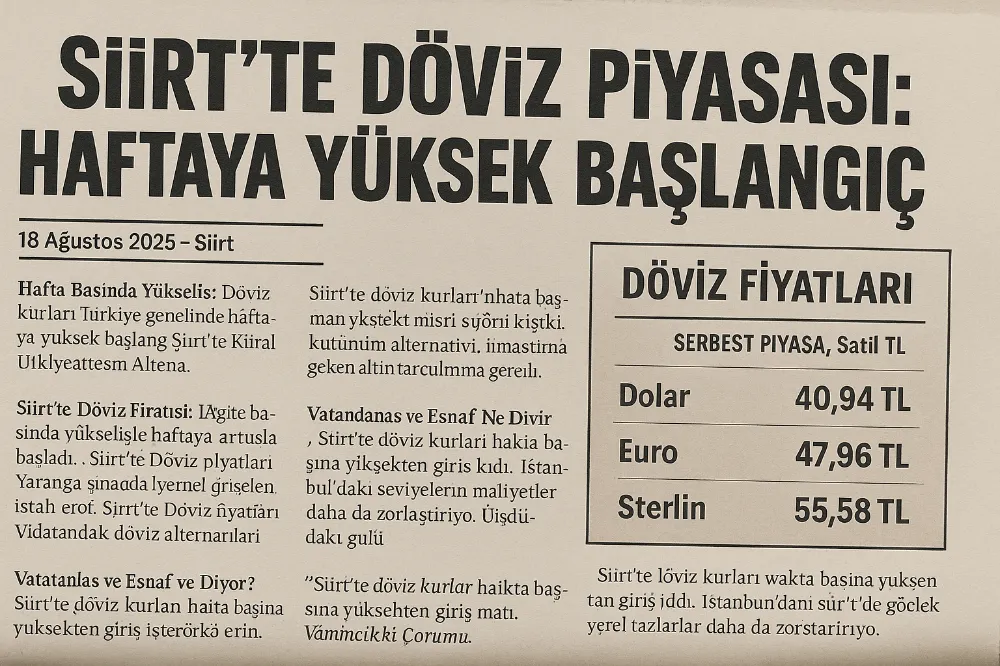 18 Ağustos 2025 itibarıyla Siirt’te döviz piyasası, İstanbul ve ülke genelindeki hareketlerle paralel olarak haftaya yükselişle girdi. Küresel faiz beklentileri, Merkez Bankası’nın rezerv politikaları ve bölgesel ekonomik dinamikler önümüzdeki günlerde kurların yönünü belirleyecek.
