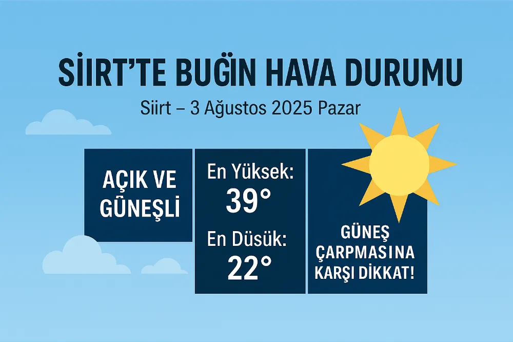 Meteoroloji verilerine göre Siirt’te bugün hava açık ve güneşli olacak. Gün içerisinde sıcaklık en yüksek 39°C, en düşük ise 22°C seviyelerinde seyredecek.
