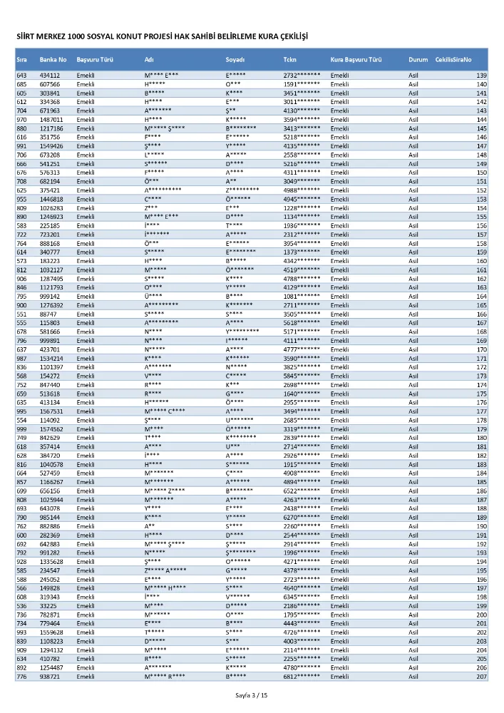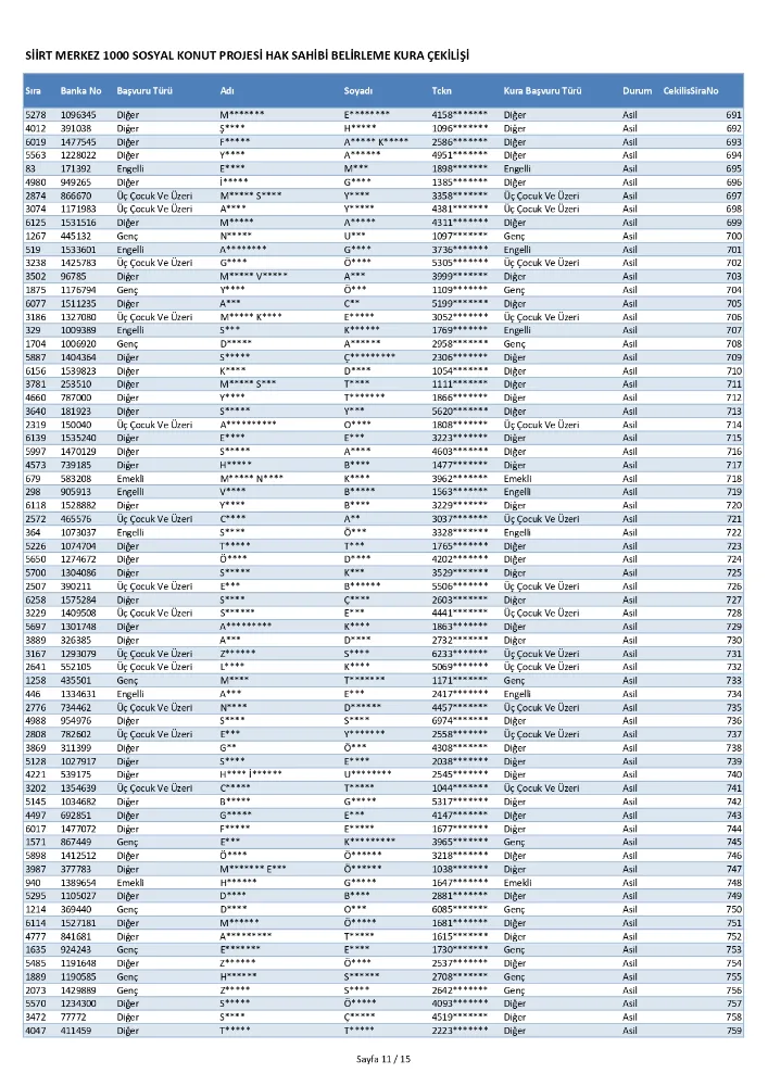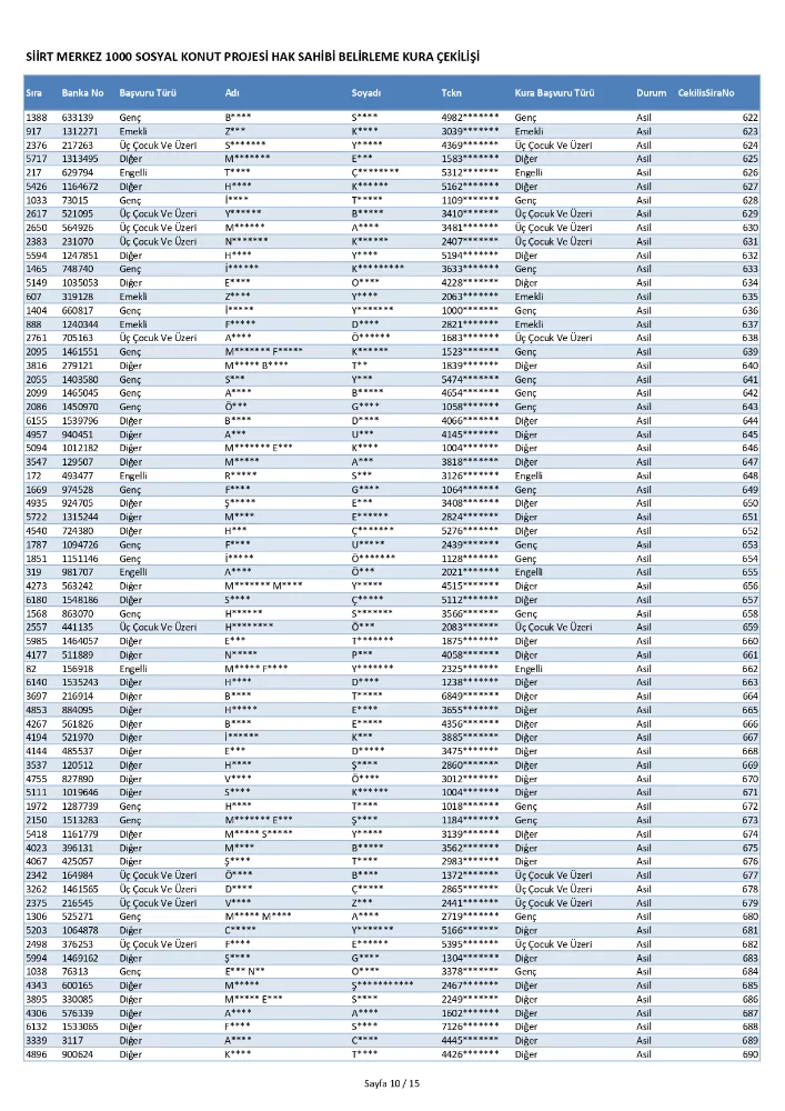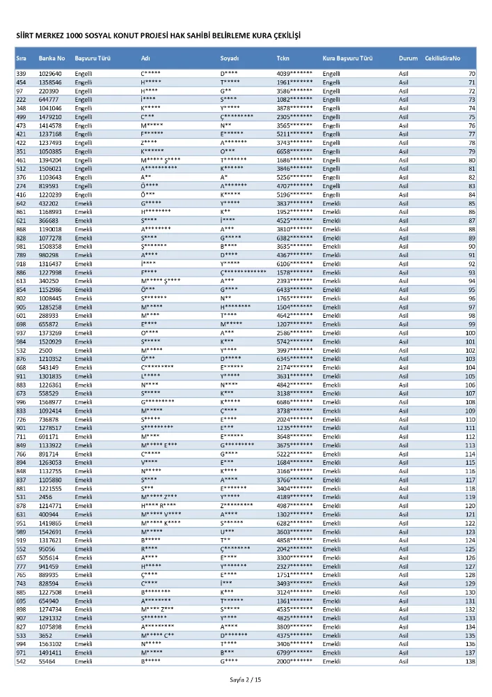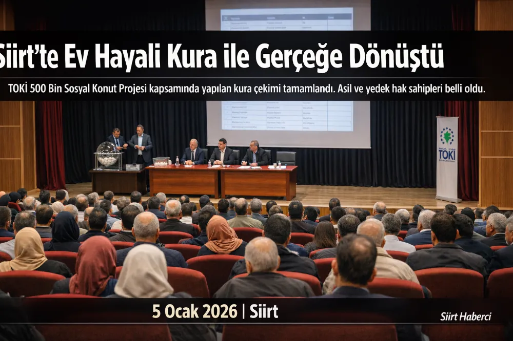 Siirt’te, 500 bin sosyal konut projesi kapsamında yürütülen TOKİ kura çekimi tamamlandı. 5 Ocak 2026 Pazartesi günü, Siirt İl Millî Eğitim Müdürlüğü Konferans Salonu’nda saat 14.00’te gerçekleştirilen kura çekimiyle birlikte asil ve yedek hak sahipleri belirlendi.
