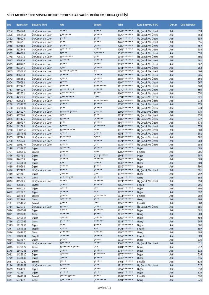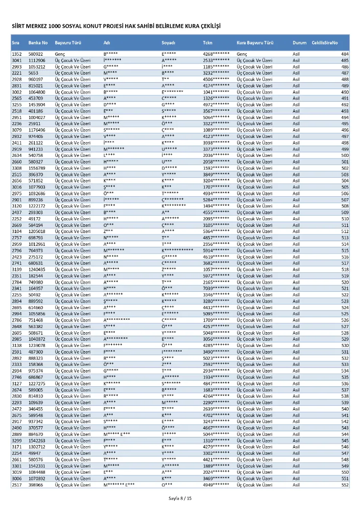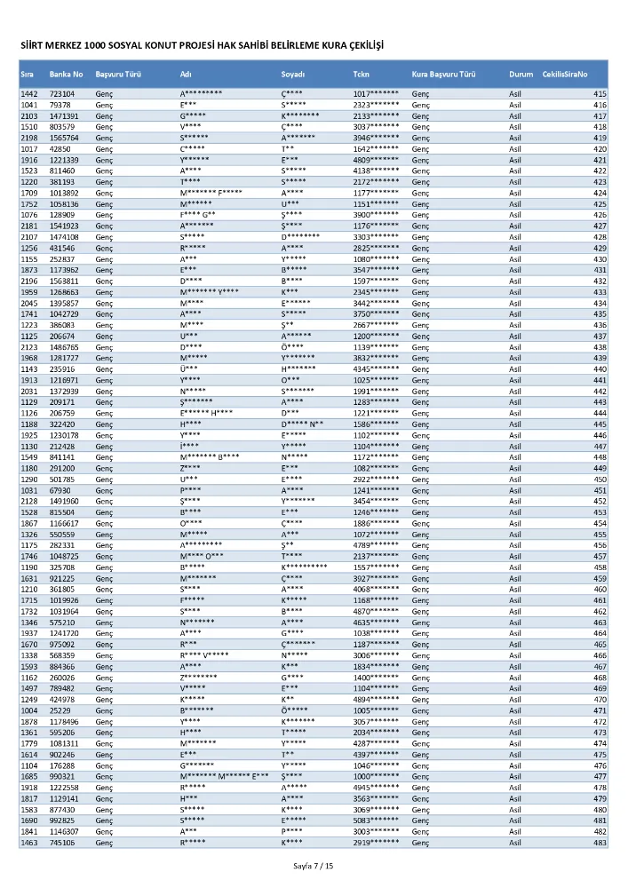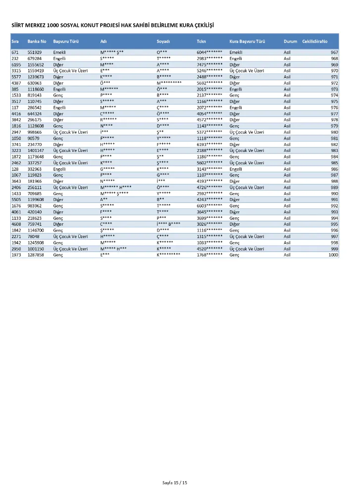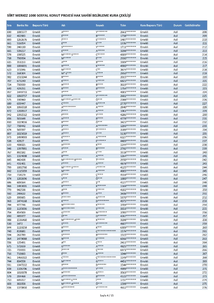 Siirt’te, 500 bin sosyal konut projesi kapsamında yürütülen TOKİ kura çekimi tamamlandı. 5 Ocak 2026 Pazartesi günü, Siirt İl Millî Eğitim Müdürlüğü Konferans Salonu’nda saat 14.00’te gerçekleştirilen kura çekimiyle birlikte asil ve yedek hak sahipleri belirlendi.