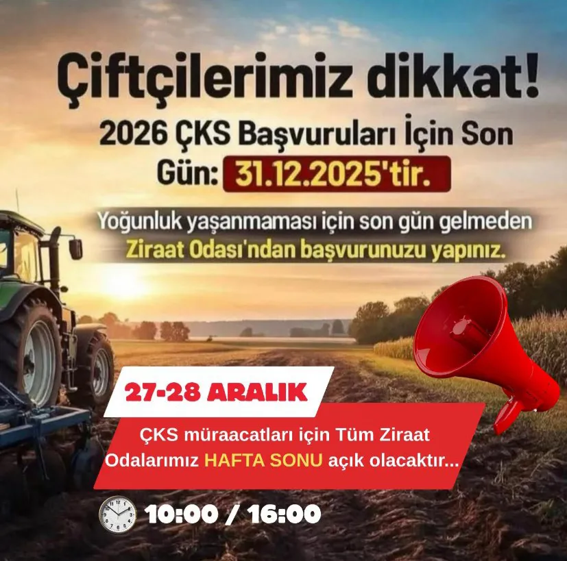 Yapılan paylaşımlarda, 2026 ÇKS başvurularının son tarihinin 31 Aralık 2025 olduğu hatırlatılarak, çiftçilerin herhangi bir hak kaybı yaşamamaları için işlemlerini son güne bırakmamaları gerektiği vurgulandı.