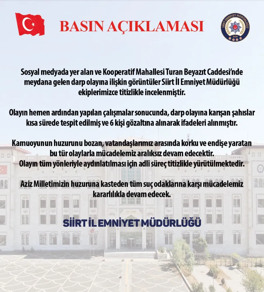 Siirt’in Bahçelievler Mahallesi Turan Beyazıt Caddesi’nde meydana gelen darp olayına ilişkin sosyal medyada yer alan görüntüler, Siirt İl Emniyet Müdürlüğü ekipleri tarafından titizlikle incelendi.