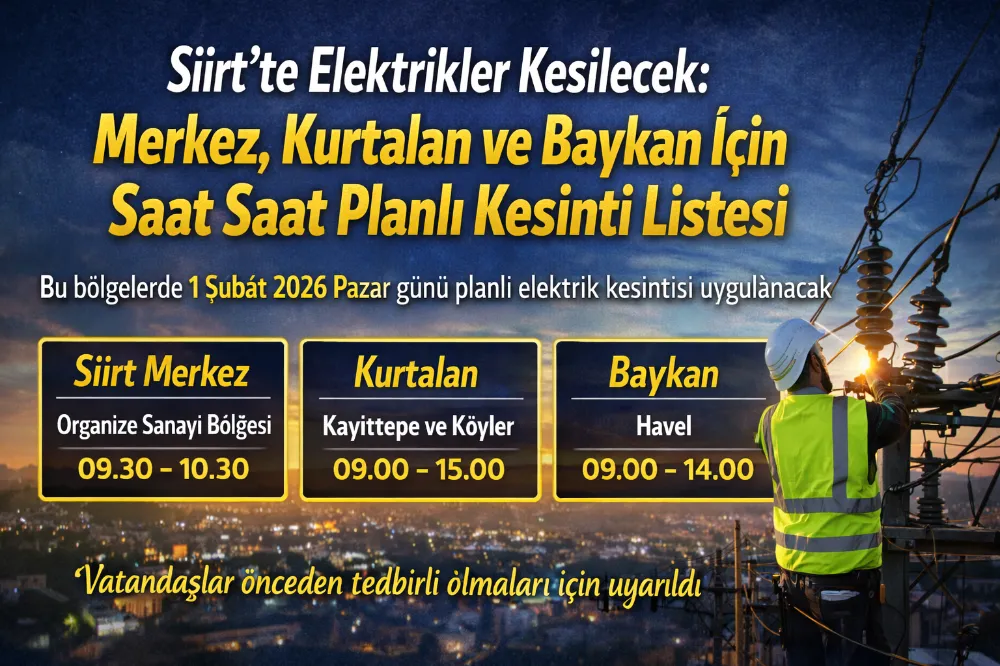 Dicle Elektrik Dağıtım A.Ş. (DEDAŞ), Siirt il merkezi ile Kurtalan ve Baykan ilçelerinde planlı bakım ve onarım çalışmaları nedeniyle 1 Şubat 2026 Pazar günü elektrik kesintisi uygulanacağını açıkladı. Kesintilerin, elektrik şebekesinin daha güvenli, sağlıklı ve kesintisiz hizmet verebilmesi amacıyla gerçekleştirileceği bildirildi.
