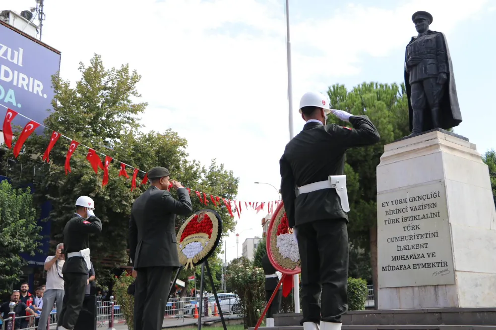 Tören, Atatürk anıtına çelenk sunulmasının ardından, Ulu Önder Gazi Mustafa Kemal ATATÜRK ve ebediyete irtihal eden şehit ve gazilerin anısına saygı duruşu ve akabinde okunan İstiklal Marşı ile başladı.