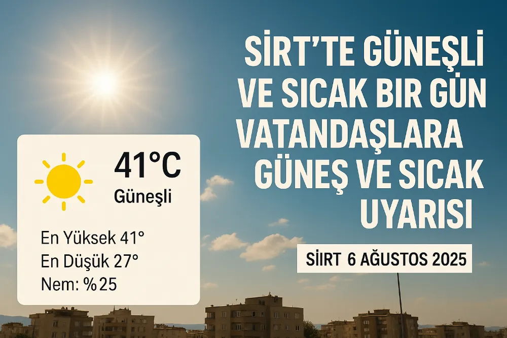Siirt'te yaz mevsimi tüm sıcaklığıyla etkisini sürdürüyor. Meteoroloji Genel Müdürlüğü'nün verilerine göre, 6 Ağustos Çarşamba günü kent genelinde açık ve güneşli bir hava hâkim olacak. Gün içinde sıcaklıkların 41°C'ye kadar çıkması, nem oranının ise %20-30 civarında seyretmesi bekleniyor.