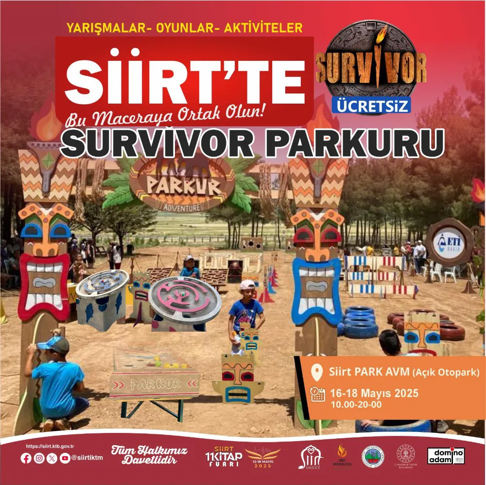Siirt’te eğlencenin, yarışmanın ve adrenalinin adresi: Survivor Parkuru! Siirt Park AVM açık otoparkında kurulan bu muhteşem parkurda, çocuklar ve gençler için unutulmaz bir deneyim sizleri bekliyor. Üstelik tamamen ÜCRETSİZ! Tarih: 16-18 Mayıs 2025 Saat: 10.00 - 20.00 Yer: Siirt Park AVM (Açık Otopark) Yarışmalar, oyunlar, aktiviteler ve daha fazlası için hepiniz davetlisiniz! Bu maceraya sen de ortak ol!